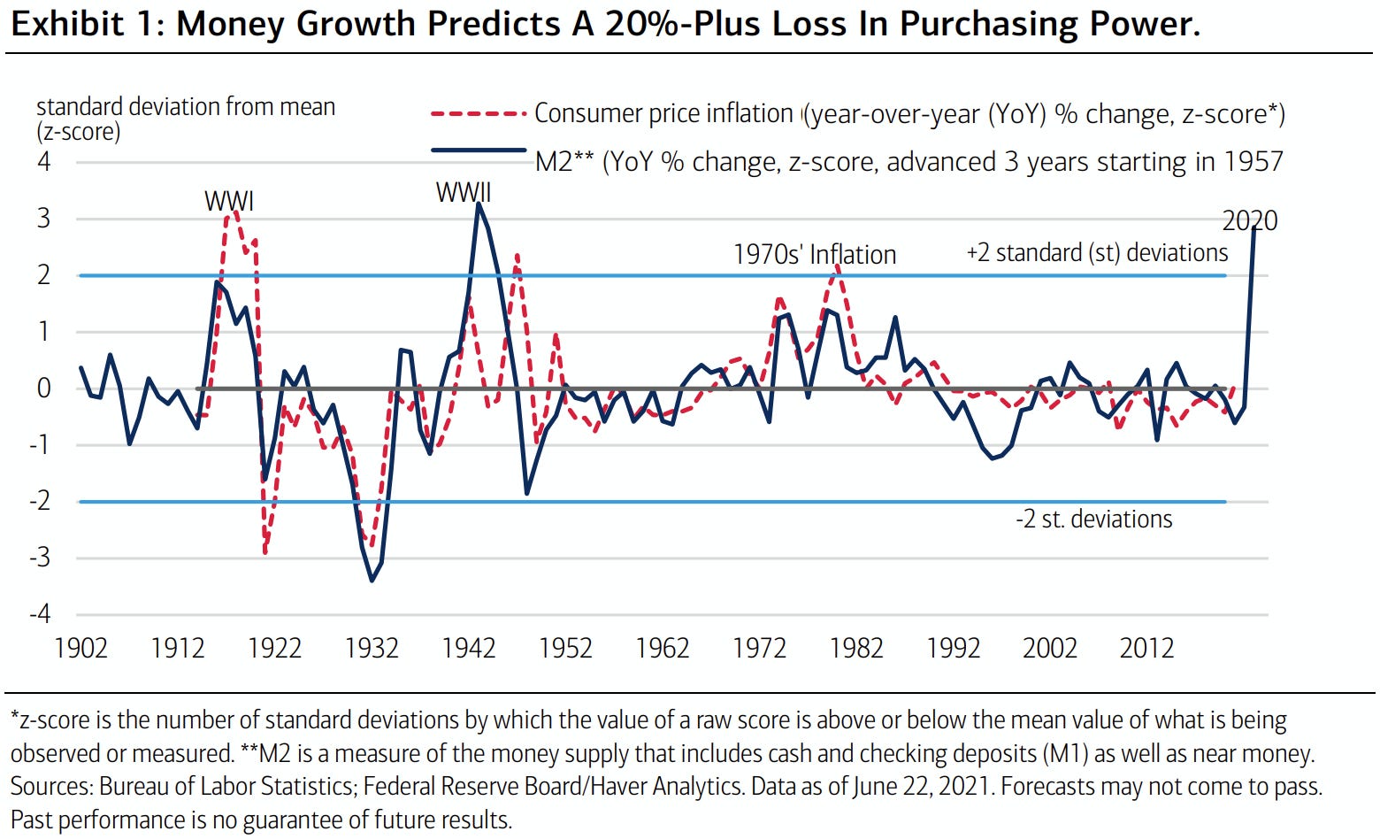 In the most recent report, there is a complete history about how M2 growth relates to CPI growth⦠and how every time we get a 2 standard deviation move in M2 growth, we always get double digit CPI growth.